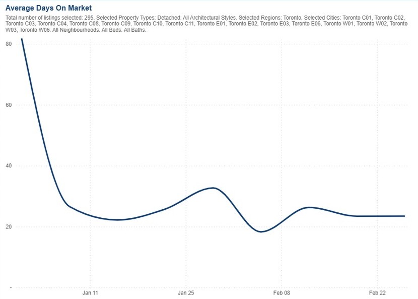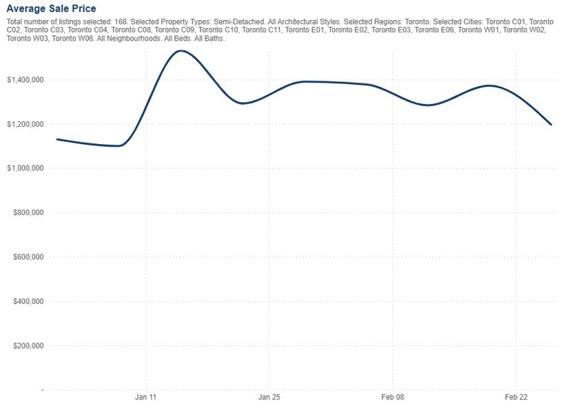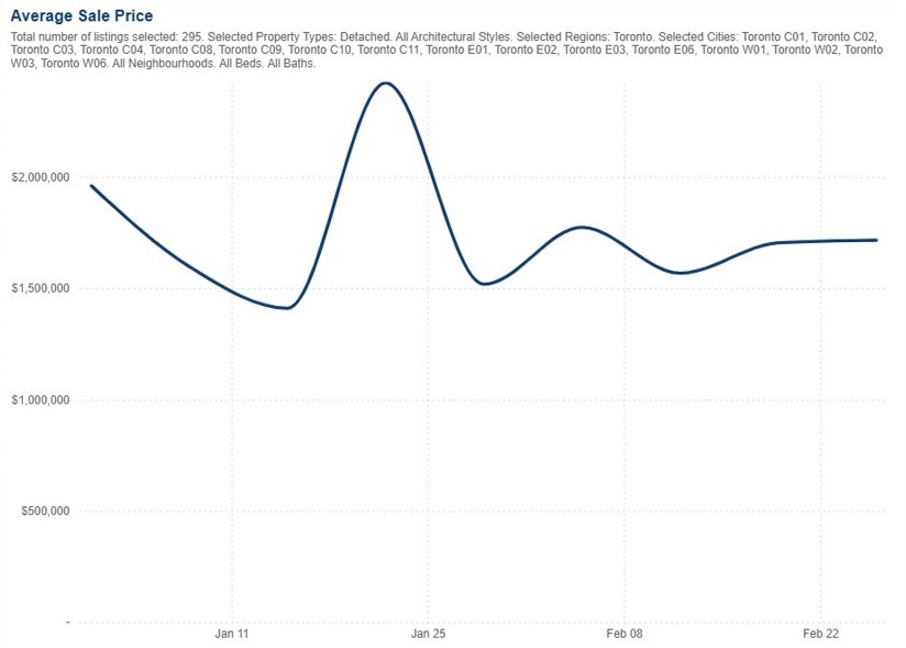 Prices climbed from ~$1.288M in January to ~$1.36M in February. Weekly fluctuations remain, but one trend is clear: homes are selling faster.