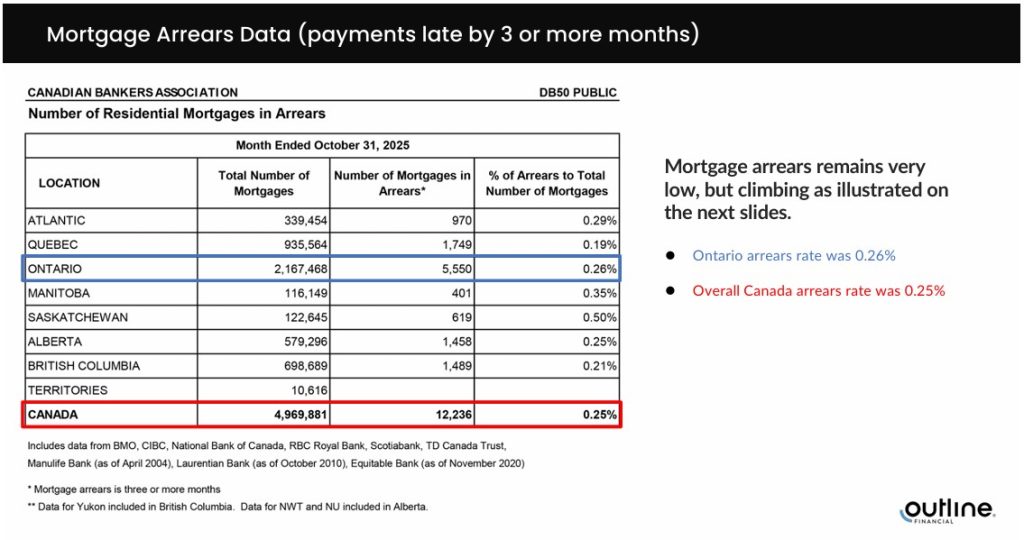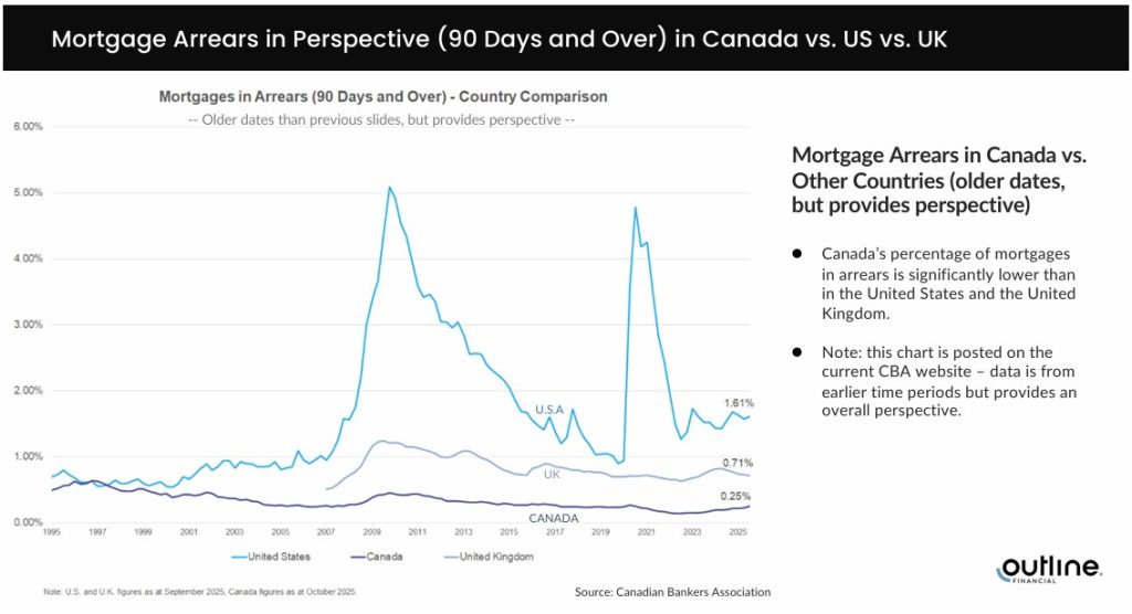 While arrears have increased from just over 0.05% in November 2022 to 0.26% in November 2025, that’s still far from crisis territory. For context, mortgage arrears currently sit at 0.71% in the UK and 1.61% in the U.S. By comparison, Canada is holding up remarkably well.